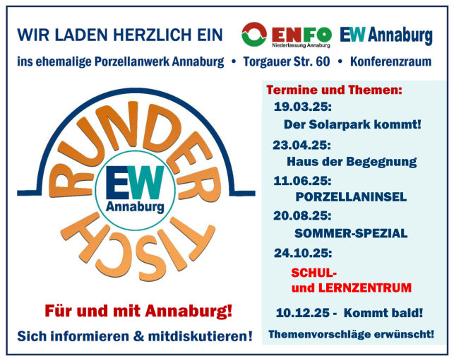Die EW Annaburg bietet seit 2024 in regelmäßigen Abständen, im Konferenzraum des neu sanierten Verwaltungsgebäudes, einen RUNDEN TISCH zur Information und Diskussion in Bezug auf die Entwicklung der Projekte im ehemaligen Porzellanwerk und in Bezug auf die Schaffung einer autarken Energieversorgung für die Stadt Annaburg und die gesamt Region.