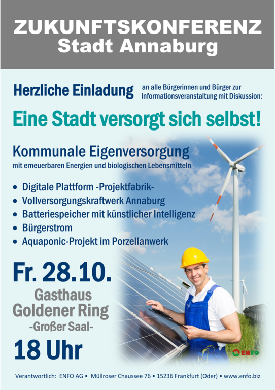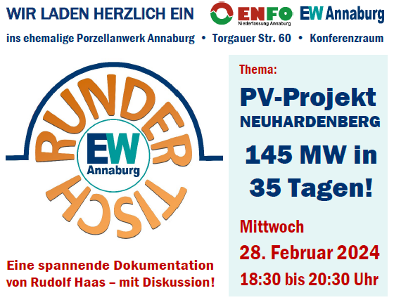 Mit 35 Besuchern wurde wiederum das große Interesse deutlich, dass es in Annaburg am Fortgang des ENFO-Projektes für eine regionale Energie-Eigenversorgung gibt. Rudolf Haas erläuterte den aktuellen Stand zur Baugenehmigung und zu den weiteren Abläufen. Eine Einspeisezusage für eine erste Teilmenge übet 90 MW in die 110kV-Leitung ist gesichert, die Baugenehmigung für den ersten Bauabschnitt für die PV-Projekte im 200m-Radius an der Bahnlinie Annaburg-Jessen nach vereinfachtem Verfahren ist in den nächsten Wochen zu erwarten. Es gab viele Hürden zu überwinden, u.a. konnte für eine Teilfläche erfolgreich ein Zielabweichungsverfahren durchgeführt werden. Aktuell werden die Planungen für den zweiten Baubschnitt im B-Plan-Verfahren, für einen großen Stromspeicher und für das neue Umspannwerk an der 380kV-Leitung vorangetrieben. Die Gesamtfläche muss noch sehr aufwendig vor Baubeginn archäologisch untersucht werden. Ab Baugenehmigung werden noch ca. 6 Monate für die Vorbereitung der ersten Baumaßnahmen benötigt.