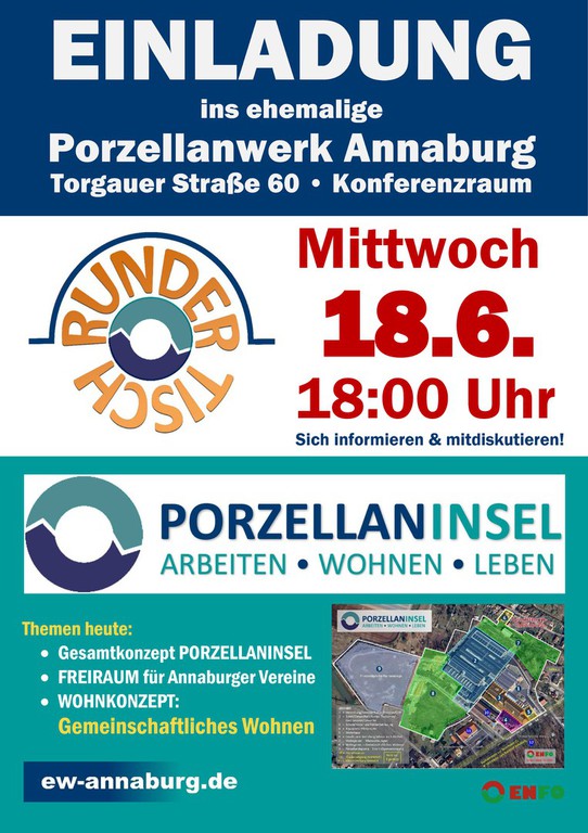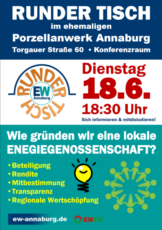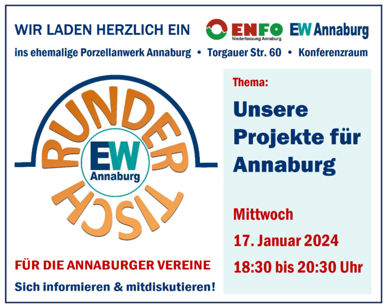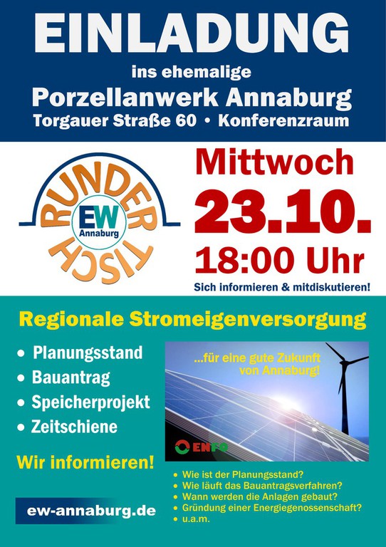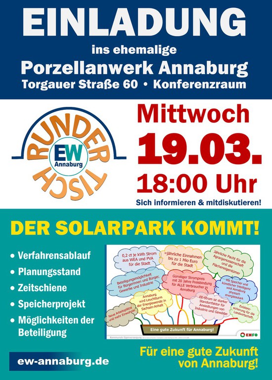 Die EW Annaburg bietet seit 2024 in regelmäßigen Abständen, im Konferenzraum des neu sanierten Verwaltungsgebäudes, einen RUNDEN TISCH zur Information und Diskussion in Bezug auf die Entwicklung der Projekte im ehemaligen Porzellanwerk und in Bezug auf die Schaffung einer autarken Energieversorgung für die Stadt Annaburg und die gesamt Region.
