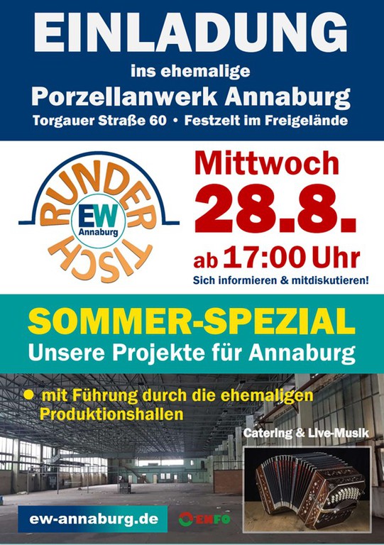 Der "RUNDE TISCH" der EW Annaburg, der allen Bürgerinnen und Bürgern, ca. alle 6-8 Wochen, die Möglichkeit gibt, sich über aktuelle Entwicklungen und Projekte zu informieren, fand am 28. August 2024, ab 17 Uhr, als SOMMER-SPEZIAL mit Hallenrundgang und Festzelt statt. Rund 180 Besucher folgten der Einladung, darunter ca. 50 Eigentümer von landwirtschaftlichen Flächen, die am Photovoltiak-Projekt der ENFO AG an der Bahntrasse Annaburg-Jessen beteiligt sind. Während die eine Hälfte der Besucher sich bei Catering und Bierwagen vergnügte und dem Bandonionspiel von Jürgen Karthe aus Dresden lauschte, folgte die jeweils andere Hälfte der Besucher, mit großem Interesse, den Ausführungen zu den künftigen Nutzungsüberlegungen von Rudolf Haas beim Hallenrundgang. Herrliches Sommerwetter und interessante Gespräche trugen zu einem guten Gelingen dieses Festes bei.
