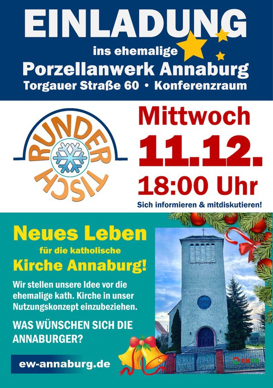 Der Runde Tisch zu diesem Thema am 11.12.2024 war gut besucht und brachte viele Anregungen für eine künftige Nutzung der ehemaligen katholischen Kirche Annaburg. Als zentrales Anliegen gab es eine große Übereinstimmung das ehemalige Kirchengebäude neu zu benennen. Als Favorit dafür kristallisierte sich heraus: "HAUS DER BEGEGNUNG"