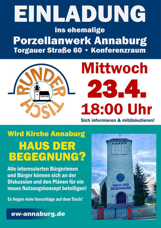 Der RUNDE TISCH für ein neues Nutzungskonzept der ehemaligen katholischen Kirche in Annaburg war wieder voll besetzt und die zahlreichen Gäste beteiligten sich intensiv an der Diskussion um die künftige Nutzung des ehemaligen Kirchengebäudes. Zuvor hatte der Beauftragte des Bistums darauf hingewiesen, dass es zum Kauf des Gebäudes durch die ENFO AG ein Einvernehmen gibt. Ein von der ENFO AG beauftragter Architekt gab Einblicke in den aktuellen Zustand des Gebäudes. Vorstand Rudolf Haas machte deutlich, dass Angebote und Veranstaltungen unentgeltlich für alle Annaburgerinnen und Annaburger, vor allem auch für jugendliche Besucher, zugänglich sein sollen. Das ehemalige Kirchengebäude soll im Rahmen eines neuen Gesamtkonzeptes PORZELLANINSEL - Arbeiten-Wohnen-Leben zum "Leuchtturm Annaburg" werden. Das neue Konzept und aktuelle Entwicklungen sind Gegenstand des nächsten Runden Tisches am 18. Juni 2025.