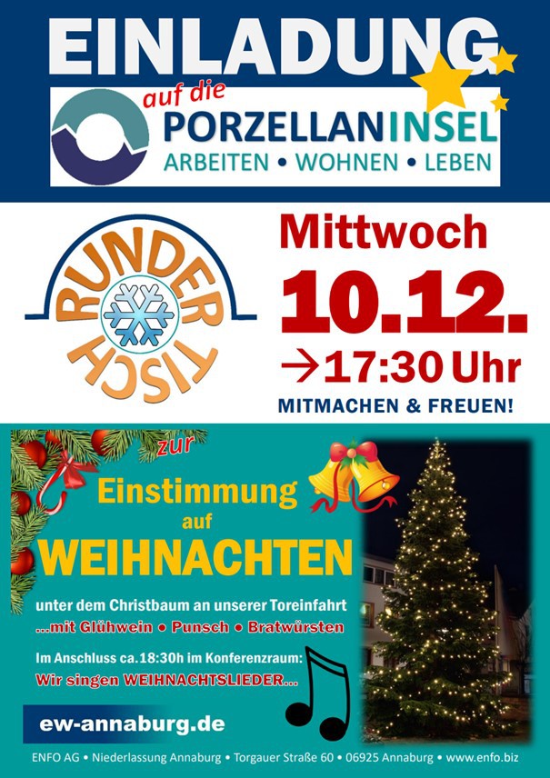 Am Mittwoch, den 10.12.2025, Beginn 17:30 Uhr, gab es einen besonderen RUNDEN TISCH auf dem Betriebsgelände des ehemaligen Porzellanwerks. Eine neue Lichterkette ließ den großen Tannenbaum im Eingangsbereich des Geländes hell erschrahlen und bei Glühwein, Punsch, Bratwürsten sowie weihnachtlicher Musik gab es einen regen Gedankenaustausch unter den zahlreichen Besuchern. Eine besondere Überraschung gab es für die Gäste mit einer musikalischen Einlage von Rudolf Haas, der mit seiner Gitarre und nachdenklichen Liedtexten ein wenig über sein Leben erzählte. Für alle Gäste ein besonderer Abend.